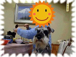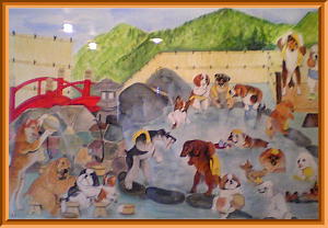 飾ってあった絵画です。 み〜んなワンが露天風呂に入ってます。 真ん中にシュナが。。。 |